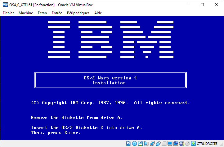 2. Démarrer la machine virtuelle, dès que l'écran avec le petit carré blanc suivi de OS/2 s'affiche, appuyer sur ALT et F1.
