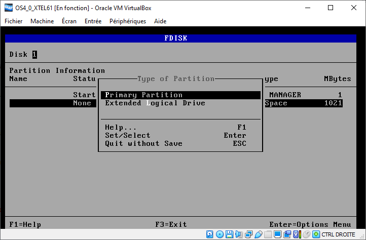 9. Il ouvre FDISK, à partir de la, créé une partition de boot (optionnel) et alloue le reste du disque au système et donne lui le status "Installable" (le nom est paramétrable, moi j'ai mis "System")