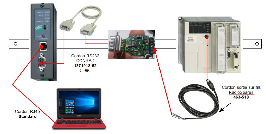 Mais, ce n'est pas de ce câble dont je voulais parler : l'autre réf. chez RS c'est le câble que nous utilisons pour raccorder l'automate à la passerelle ETIC IPRS-100 ind.1. Nous le coupions pour conserver d'un côté la prise mini-Din et de l'autre les fils que nous raccordions sur des bornes à vis.
