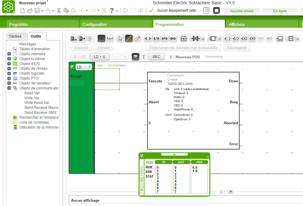 %SEND_RECV_SMS0 affecté à SL1 ou à SL2 seul dans un Rung. Le simulateur ne marche plus (plus de scrutation, comme figé) si quelqu'un à le SoMachine Basic sous la main pour tester ça, car ça ne le fait qu'avec ce bloc seulement, comme c'est bizarre , vous avez dit bizarre ?
