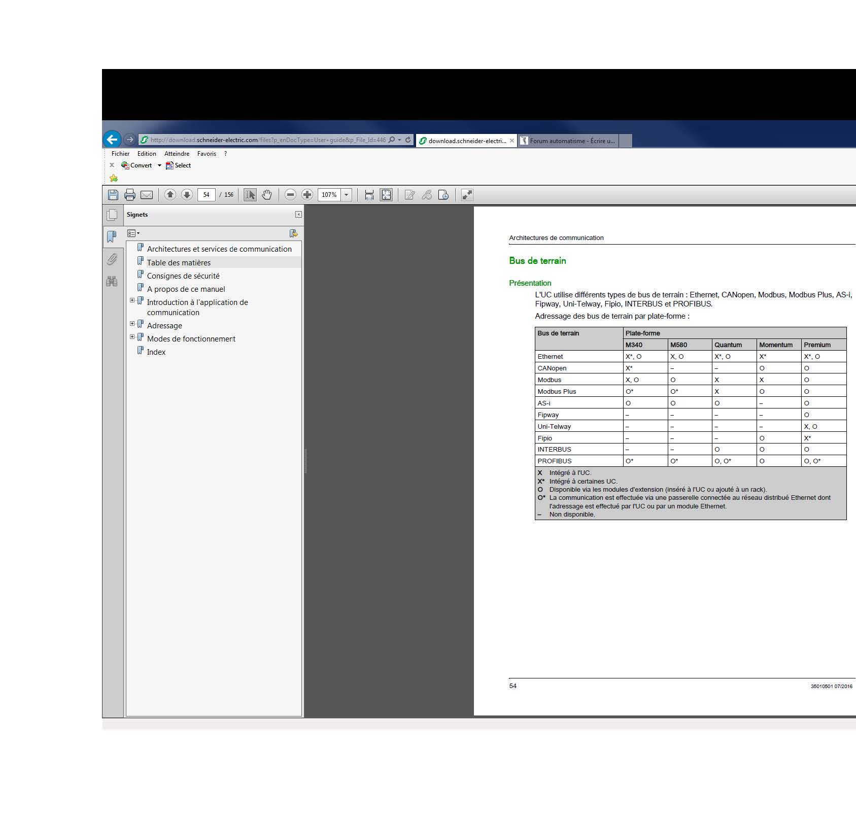 S'ils veulent remplacer le Premium c'est que forcément ils veulent pas le garder. Donc je pense qu'il faudra faire passer la pilule pour upgrader le bus FIPIO. De toutes façons en gestion d'obsolescence ça ne sert à rien de faire les choses à moitié. Une panne sur le FIPIO pourra aussi être pénalisante que sur la CPU (enfin je ne connais pas la machine).ngc0224 a écrit : ↑17 août 2017, 09:47 Il me semble que les passerelles type AnyBus sont FIPIO agent uniquement et ne peuvent pas fonctionner en FIPIO maitre. La seule solution pour ne pas toucher le bus de terrain est de conserver le Premium comme FIPIO maitre et de rajouter un M580 qui exécute le programme, scanne le Premium qui prend une fonction de passerelle MBTCP / FIPO. Cela nécessite aussi que le Premium soit équipé en module Ethernet pour recevoir la lecture du M580 en MBTCP.