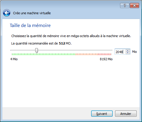 On sélectionne la RAM alloué à l'invité, la barre qui apparaît représente la RAM disponible de l'hôte. Vous pouvez tenter une intrusion en zone orange, voire rouge, mais sachez que que la RAM ne sera plus disponible pour l'hôte quand l'invité aura démarré, et vu que c'est l'hôte qui supporte l'hyperviseur, au final l'invité ne sera pas plus rapide puisque l'hôte souffrira du manque de RAM. (Ce paramètre n'est pas définitif et peut être réajusté plus tard)
