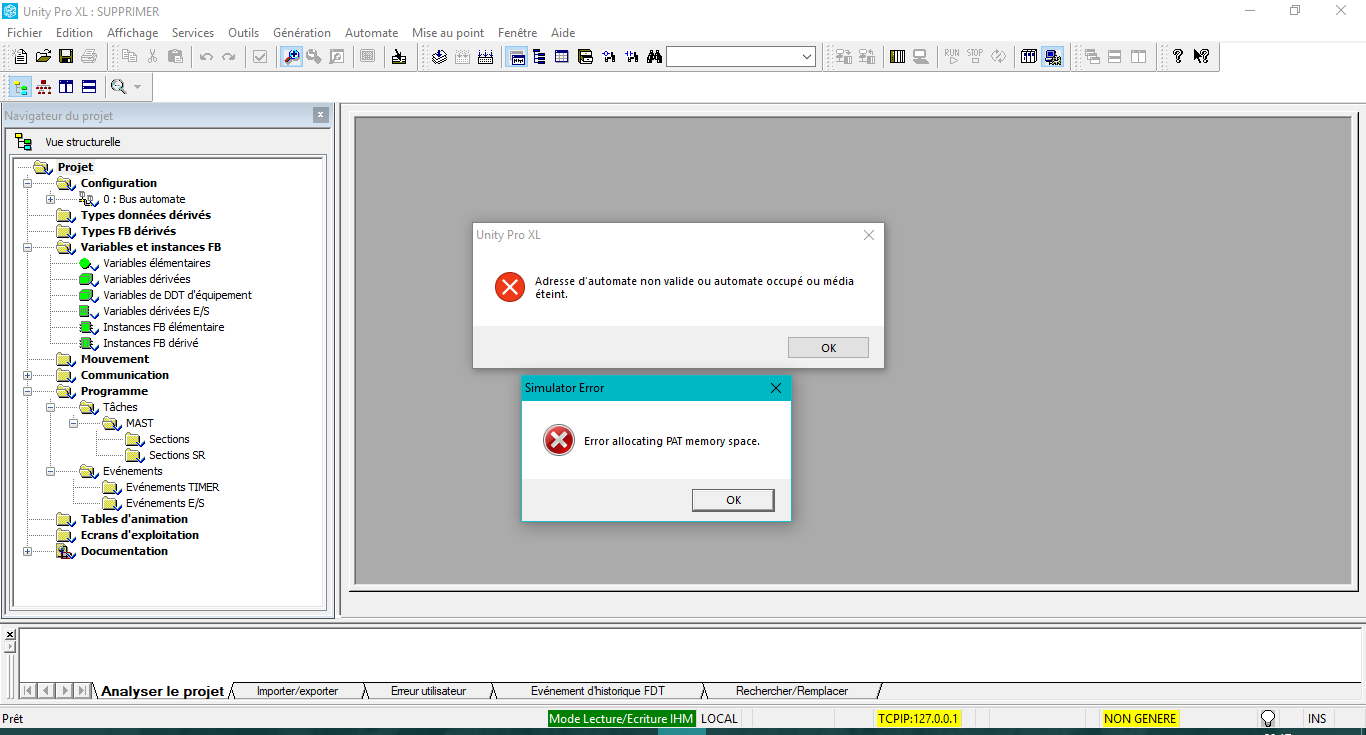 Etant débutant sur unity pro, j'ai jusqu'à présent utilisé que le mode simulateur et ce sans souci. Mais j'ai ressèment eu l'occasion de me connecter à un automate M340. à ma deception, j'ai eu un souci de connection, je me suis dis que cela venait du driver. J'ai en conséquence téléchargé et essayé d'installer celui fourni sur le site de Schneider, le "TSXCUSB and TCSMCNAM DRIVER" mais lors de l'installation il a détecté que j'avais déjà le driver et donc l'installation à été interrompu. Seulement maintenant j'ai le même problème en mode simulation. Et information supplémentaire, je n''ai pas été sur le logiciel depuis plusieurs mois, donc je ne sais pas si le problème vient de ma récente manipulation ou si il aurait pu apparaître bien avant. je vous join un imprime écrans.