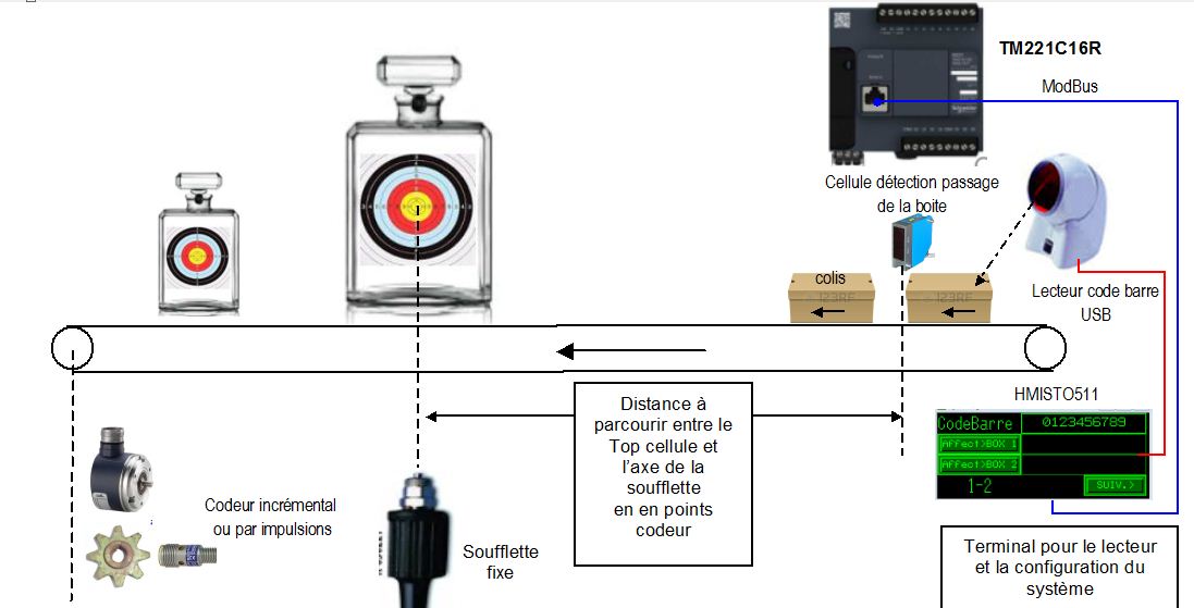 - Avec codeur ou impulsion, on mesure le diamètre de chaque flacon et on corrige la distance en conséquence. (pour que la soufflette vise toujours le centre du flacon)
