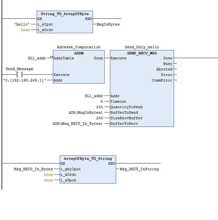 De toute façon le bloc ADDM n'est exécuté que sur front montant de la patte "Execute" donc pour moi on n'a pas forcément besoin de conditionner par le busy ou le done mais ça ne peut pas nuire. Par contre il serait intéressant de compter les error en sortie du SEND et mémoriser le compte rendu pour voir éventuellement ce qui cloche. Par contre je ne comprend pas ton histoire de deux réseaux. En mettant "3" en tête d'adresse IP tu lui dit que tu veut utiliser le port Ethernet intégré du M241. Qu'elle est l'adresse IP configurée pour ce port ? si elle n'est pas dans la même plage que ton appareil ça ne marchera évidemment pas. Cela dit, utiliser une com ASCII de nos jours n'est pas forcement une super idée. Ça a toujours été la plaie de mettre en œuvre ce genre de com et a partir du moment ou Ethernet est apparu on s'est empressé d'oublier l'ASCII. Il n'y a pas d'autre protocole plus moderne et standardisé sur ton machin chauffant ?