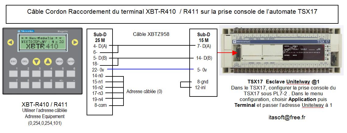 A savoir que la prise console du TSX17 est exclusivement en Unitelway esclave le seul IHM commercialisé que l'on peut raccorder dessus c'est le