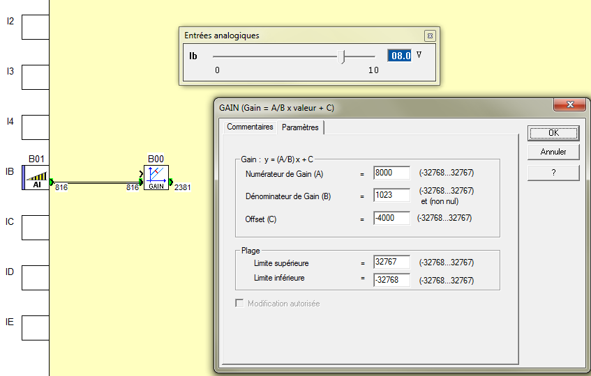 Il est possible toutefois d'utiliser le bloc fonction "Gain" permet de faire une mise à l'échelle un peu plus "intuitive" par exemple en passant d'une plage de variation de la valeur numérique de 0 à 1023 à une plage de variation de -4000 à +4000 pour obtenir une valeur numérique lisible en centième de °C.