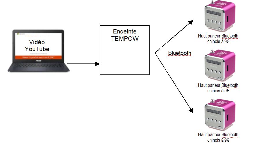 effectivement Enceinte TEMPOW correspondrait bien, mais pas trouve si c'est commercialisée, pas trouvé de doc détaillée. et pas trouvé combien on peut mettre de hauts parleurs Bluetooth au maxi. Podo Labs Belle