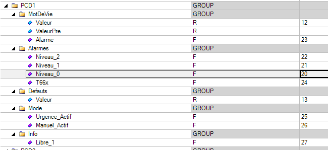 Les bits de mes alarmes sont adressés : Automate 1 : Flag 20 à 27,