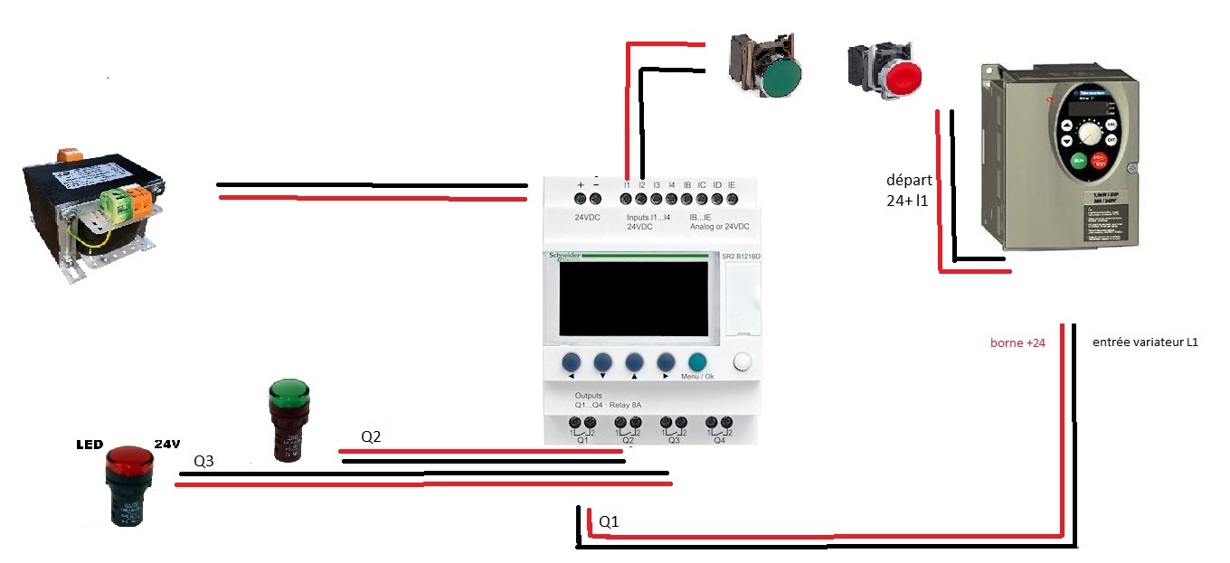 - Ton transfo tel que représenté délivre du 24V alternatif, il faut du continu (24VDC indiqué sur le zelio).