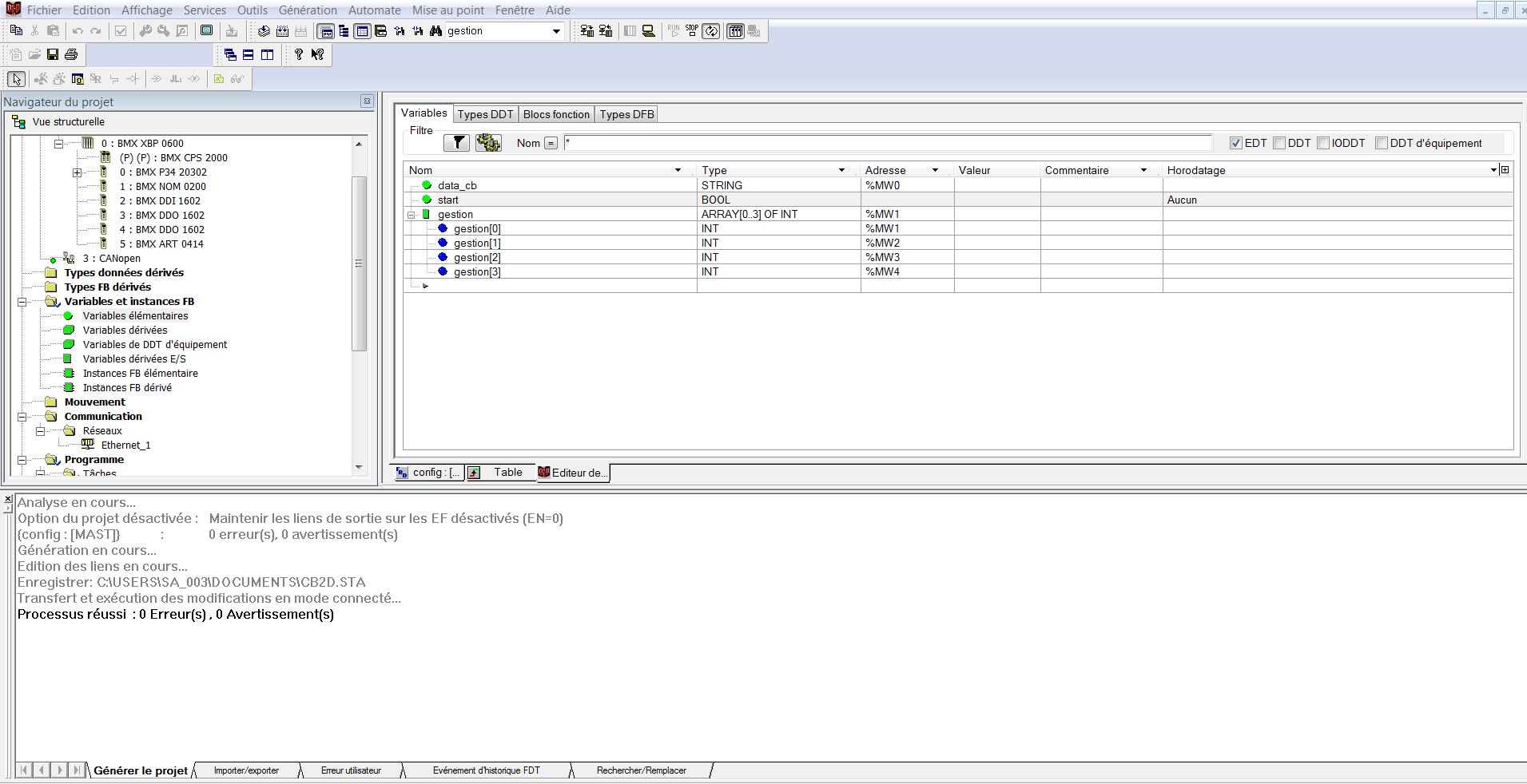 Dans le cadre de mes études en apprentissage, je dois réussir à importer des données d'un lecteur code barre SR-1000 de chez Keyence vers un automate M340. je suis parti sur du FBD et j'ai choisi les blocs ADDM et INPUT_CHAR afin de pouvoir lire les infos du Keyence avec l'automate. J'ai tout relié sur un switch et je programme sur Unity. Mon problème est que ma fonction INPUT_CHAR je me sort aucune valeur.