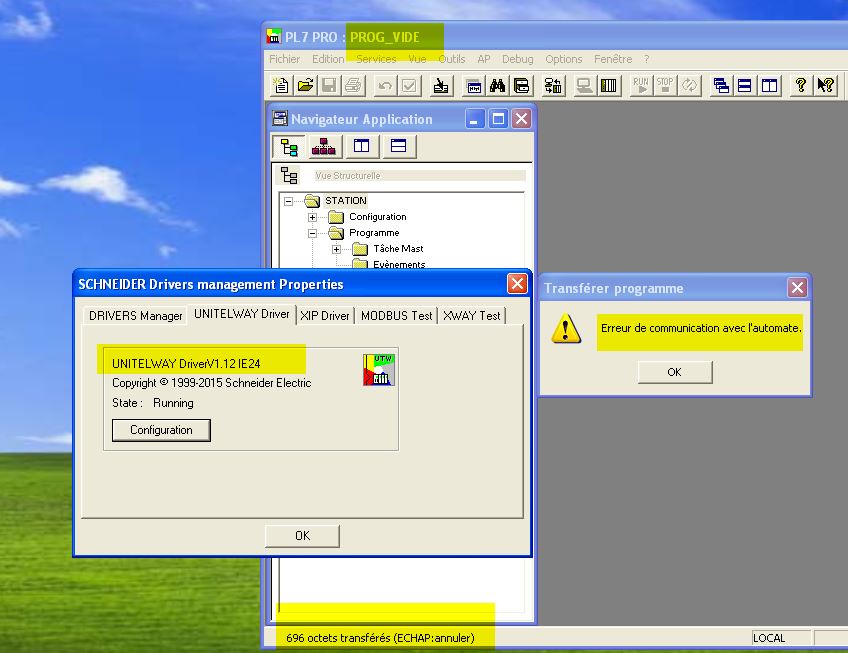 Je rencontre un problème lorsque je lance le transfert du programme vers mon TSX57 neuf (programme stx vide pour tester la configuration matérielle) :