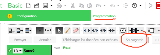 C'est très simple : quand le programme en mémoire de travail est différent de la mémoire non volatile, le bouton "Sauvegarde" de l'onglet Programmation devient actif. Il suffit de cliquer dessus pour synchroniser la mémoire non volatile (c'est très rapide).