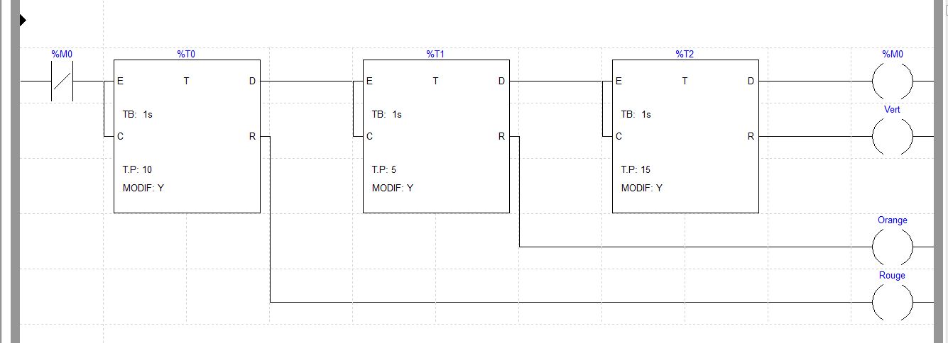 Allumer une lampe ROUGE pendant 10s puis allumer une lampe ORANGE pendant 5s puis allumer une lampe VERTE pendant 15s (éteindre la précédente à chaque fois)