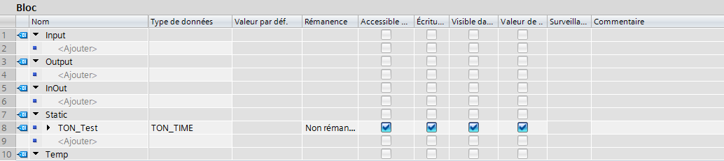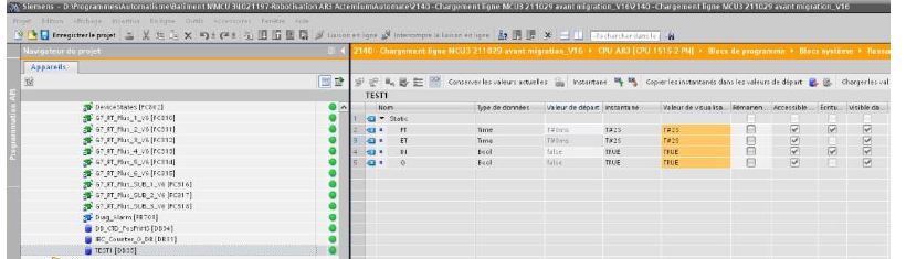 En gros, lorsque j'ai chargé ma modification et que le DB d'instance a été réinitialisé. Les tempos concernées ont l'In activées, la valeur courante est égale à 0 puisqu'il n'y a pas eu de changement d'état de l'IN et la sortie est égale à 0.