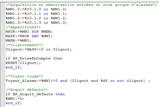 Cette alarme regroupée doit être à ré-apparition, c'est à dire que sur un front montant, elle se met à clignoter. Après avoir pris en compte le défaut en appuyant sur un bouton, elle s'allume en fixe jusqu'à ce que le défaut soit réglé puis acquitté en local.