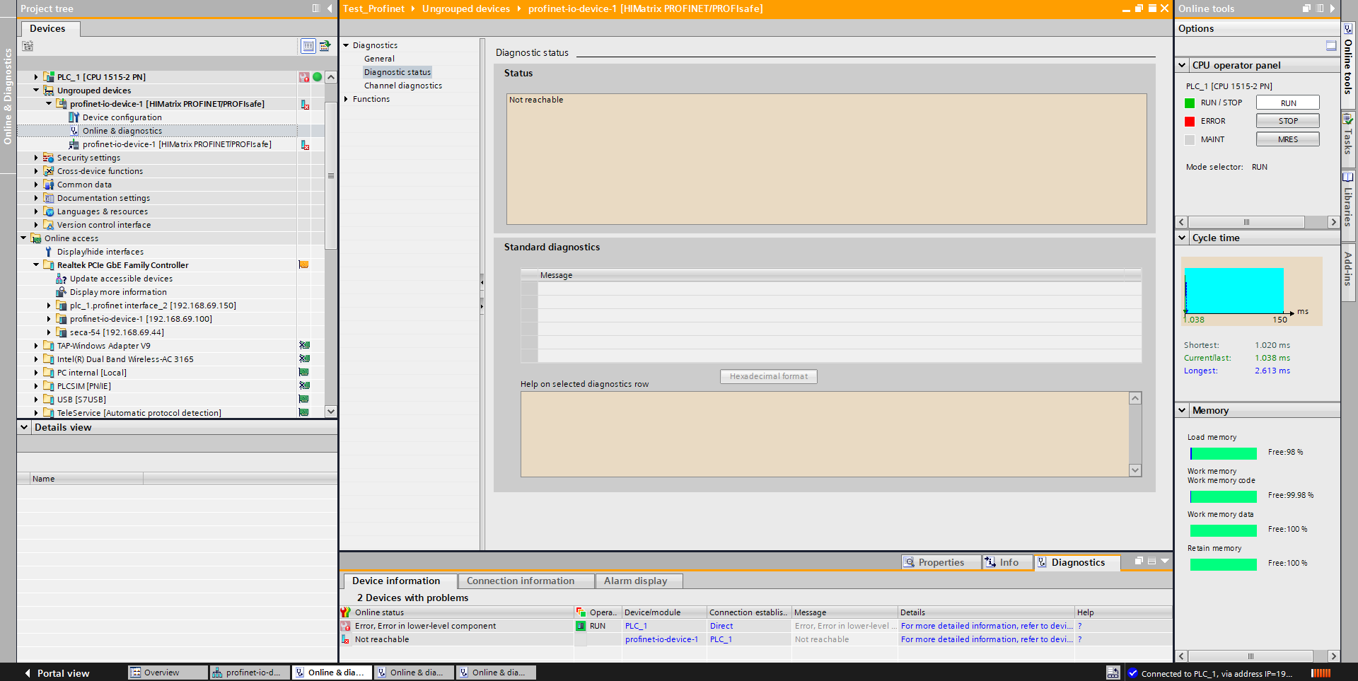 Au niveau TIA c'est sur que tu bien configuré ton Himatrix comme un IO device mais il faut lui assigner un maitre et je pensais que tu l'avais fait parce que c’était comme ça sur une de tes captures d'écrans.