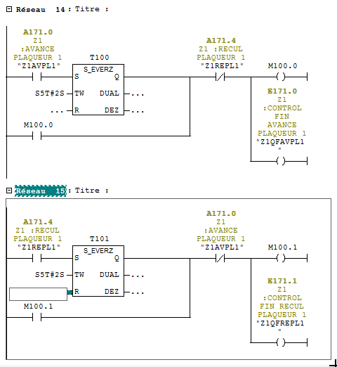 Soit par exemple un mouvement par verin, A171.0 commande l'avance, E171.0 est le detecteur fin avance, A171.4 commande le recul et E171.1 le détecteur fin recul. Ici l'entrée est mise à jour par le processus de mise à jour de les entrées.