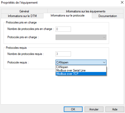 Les DTM pour ATV présents par défaut dans Control Expert utilisent le protocole Modbus TCP.