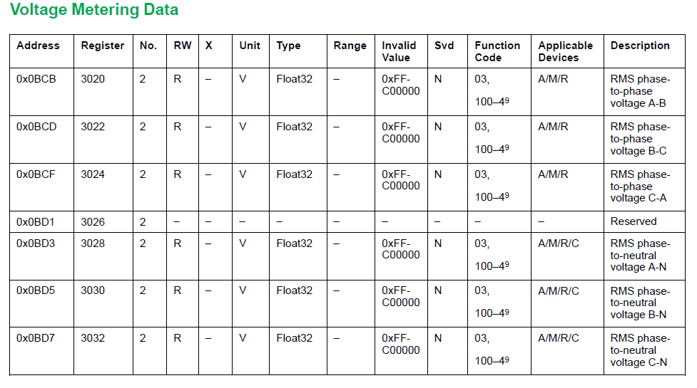 J'ai trouvé la solution et je ne sais pas comment je suis passé à coté sachant que j'ai déjà essayé ce cas.. mais grâce à vous j'ai trouvé la solution (enfin je pense reste à confirmé) mais j'ai décalé l'adresse de départ et agrandis l'index de réception. J'ai trois valeurs cohérentes maintenant, je vais vérifier avec la requête pour les tensions triphasés.