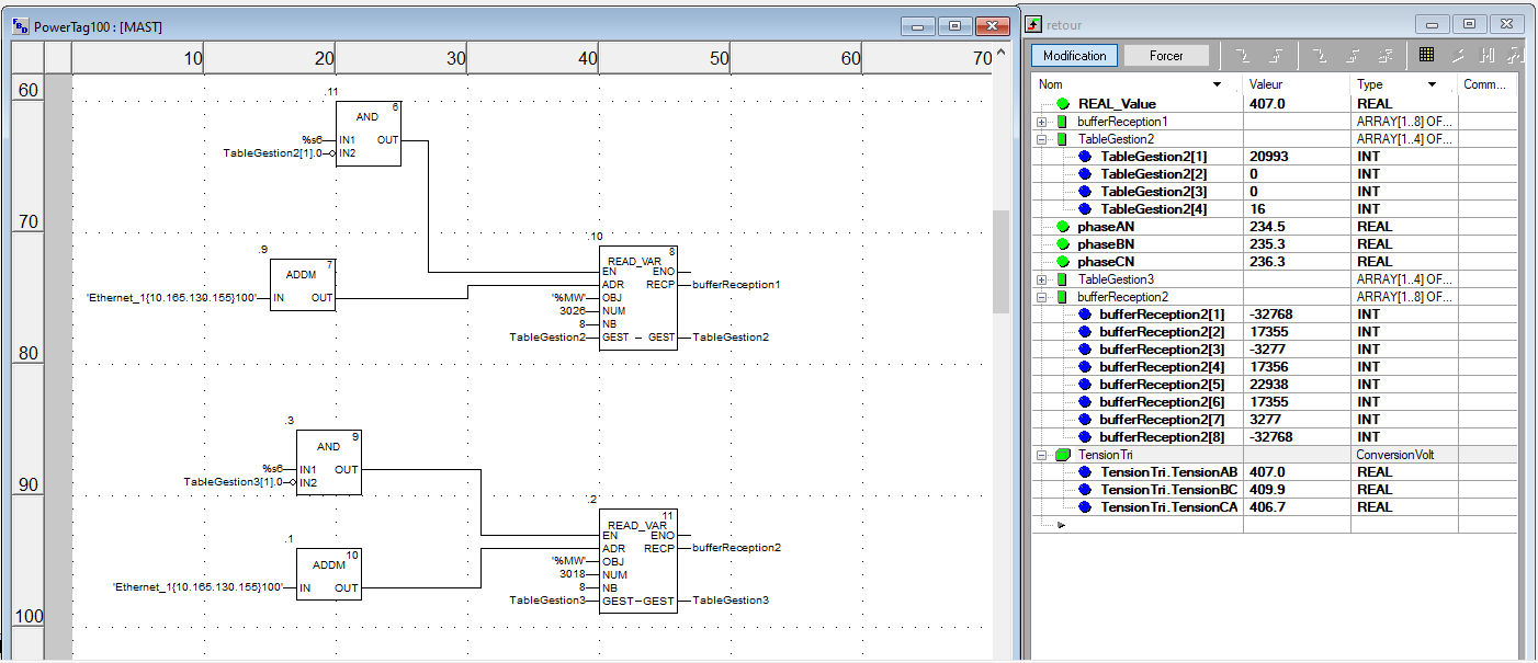 Je dois remonter des infos de comptage d'une passerelle vers un M580, n'ayant qu'un M340 à ma disposition pour le moment, c'est donc ce que j'utilise. Mon problème est le suivant, je récupère bien les valeurs que je souhaite sauf la dernière, je m'explique: avec mon Bloc READ_VAR je lis dans un registre de 3028 à 3032 pare exemple, je converti en real (j'adresse des REAL sur la même adresse que sur les INT) et là pour ma première et deuxième valeurs récupérer j'ai bien les bonnes valeurs, mais pour la troisième j'ai une valeur de 0 soit random.. J'ai essayé de taper dans un autre registre mais pareil la troisième valeur est erronée alors que les deux premières sont correctes. J'ai pensé peu-être à la valeur du timeout du bloc READ_VAR mais je ne trouve toujours pas pourquoi après avoir essayé plusieurs solutions (prendre une plus grande plage dans le registre de la passerelle etc ..mais toujours cette 3e valeur fausse).