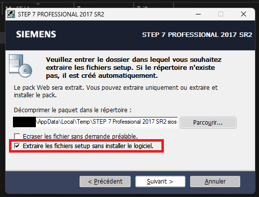 Étape 2 -> Lancer le fichier d’installation en cochant " Extraire les fichiers setup sans installer le logiciel "