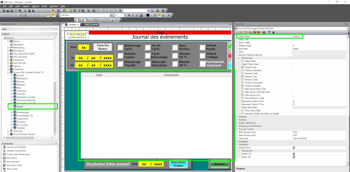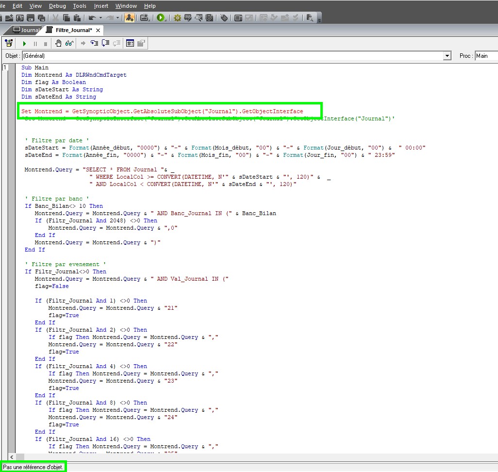 Je te confirme que j'ai bien un écran nommé "Journal", dans lequel est bien présent un objet nommé "Journal" qui affiche les données présentes dans le datalogger lui même nommé "Journal". Pour autant, je fais toujours face à ce même message (10094) Automatisation ActiveX : La var Object est ‘Rien’. J'ai constaté cependant que le numéro de la ligne indiqué par le message d'erreur bouge parfois... Actuellement il m'indique un défaut ligne 22. Mais quand il me propose d'ouvrir l'éditeur de script pour me montrer l'erreur, cette dernière est toujours présente sur la ligne 7:
