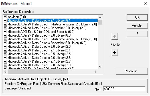 En fouillant un peu dans le logiciel et diverses docs, je suis tombé sur la fenêtre « Références » dans laquelle je peux activer/désactiver des options/menus… J’ai coché tout ce que j’ai trouvé contenant la référence ActiveX, mais là aussi sans succès… J’avoue que je tente certaines choses de manière totalement aléatoire !