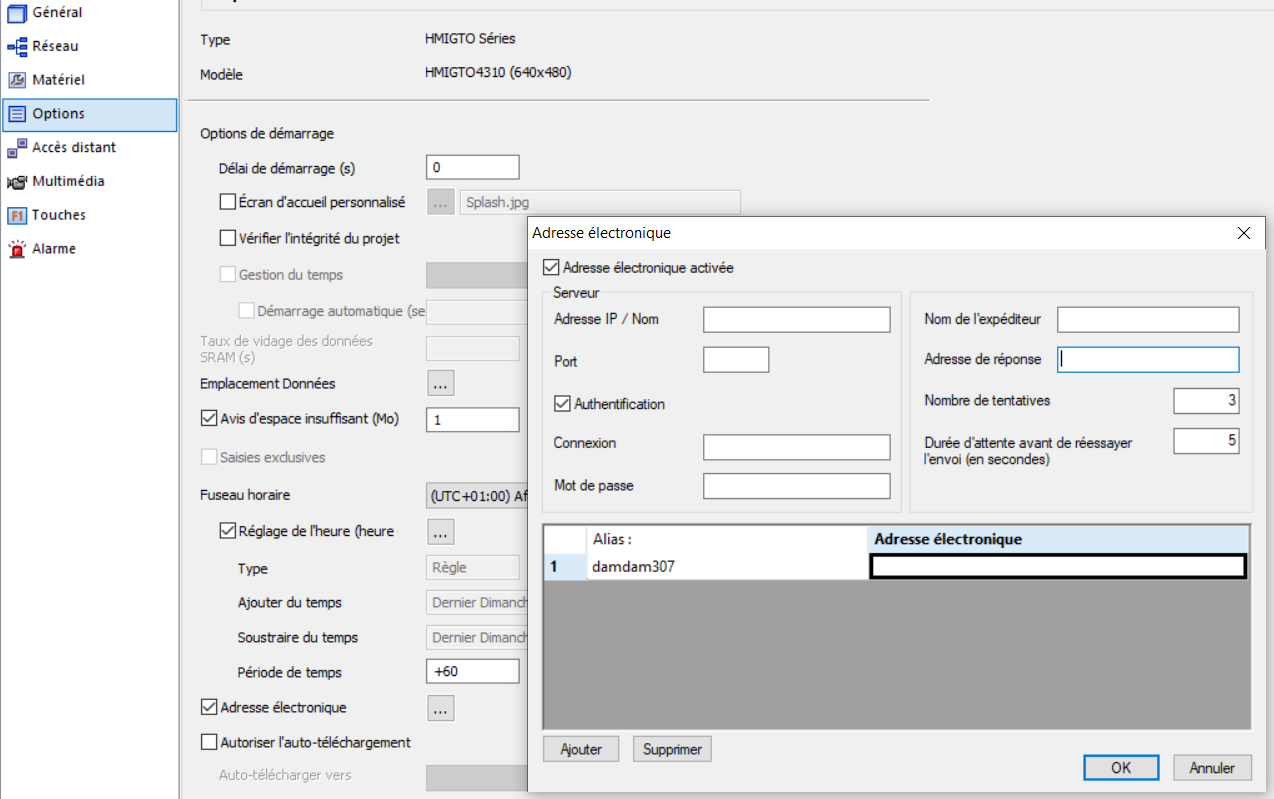 - Sélectionner "lecteur optionnel" pour : fichier donnée/formulaire et journalisation des données, alarme, etc...