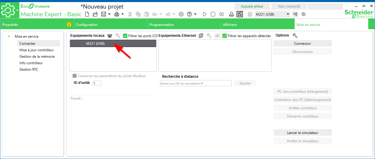 Les Leds de l'automate sont toutes en vertes, le pc détecte l'automate et s'affiche dans les périphériques comme un M221 controller. J'ai également testé avec d'autres pc et ça ne fonctionne toujours pas.