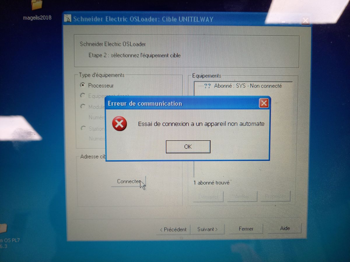 Ce message apparaît dès l'étape 2 de sélection de l'appareil cible : je parviens bien à voir mon abonné (et même à passer en STOP / en RUN ma CPU), et dès que je clic sur Suivant, le message apparaît (je suis donc très loin d'un premier transfert de l'OS temporaire ou l'OS définitif de la procédure Schneider).