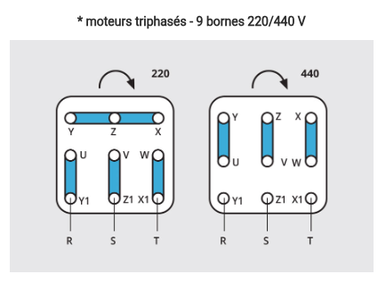 Il faudrait une photo de l'intérieur de la plaque à borne pour vérifier que tu y trouve bien ces 9 repères Y,Z,X et U,V,W et Y1,Z1,X1.
