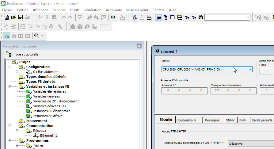 D’après ce que j’ai compris, il faut, dans ControlExpert, créer un réseau, lui attribuer une adresse IP (je ne sais pas encore laquelle indiquer ici), puis l’associer au port Ethernet (et non série) de l’automate. Je parviens bien à créer le réseau, mais je n’arrive pas à le lier au port Ethernet (cf. première image).