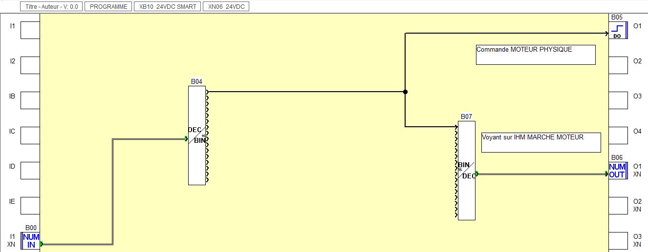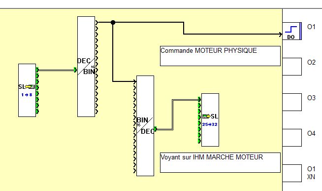 Quelle serait la méthode à suivre dans le programme FBD pour par exemple, allumer un moteur physique avec mon entrée numérique de l'écran, c'est ça que je voudrais faire quand je parle de sortie analogique.
