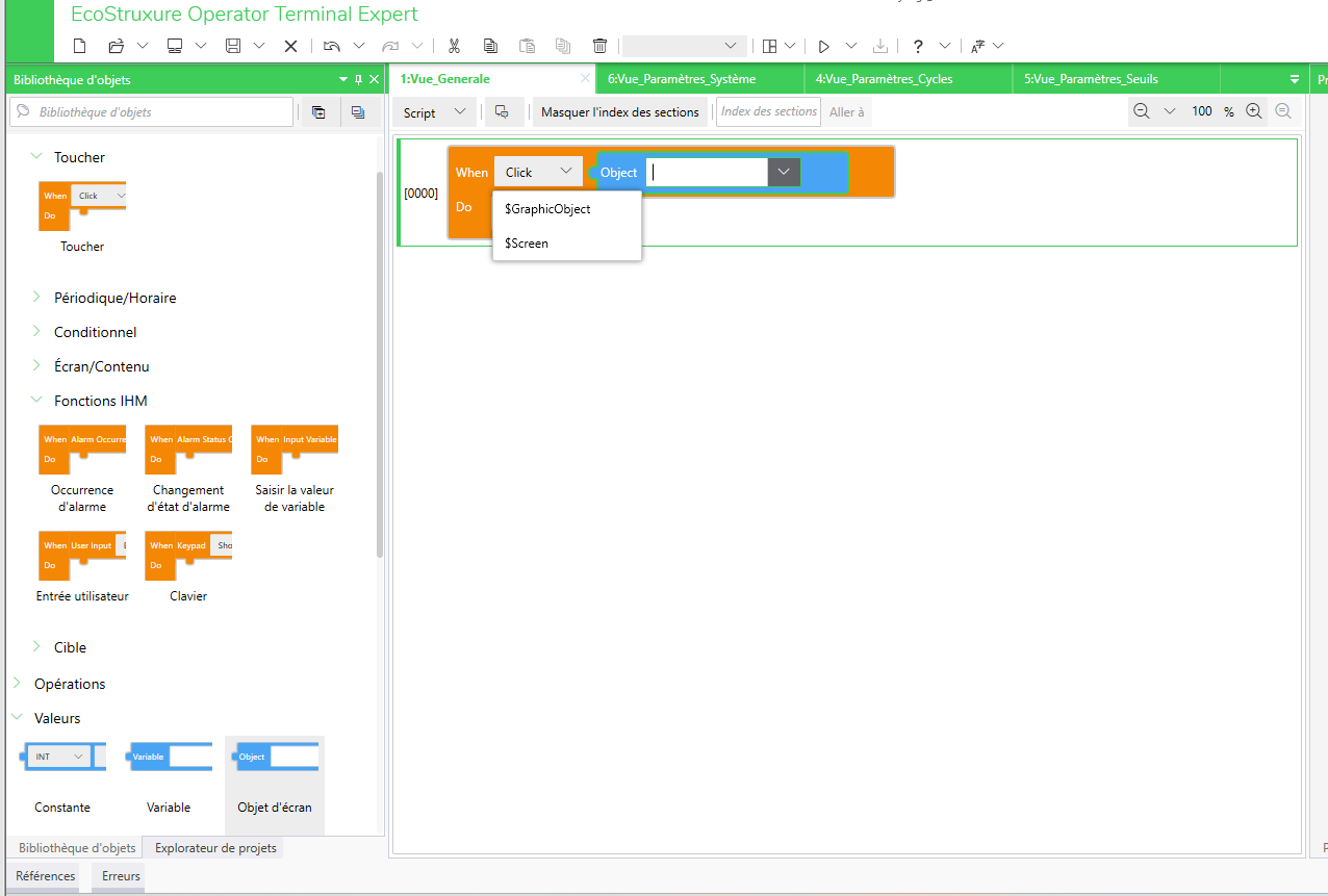 Dans le script de l'écran, j'ai sélectionné « Clic » et « Objet », mais aucun objet n'apparaît à l'écran, seulement « $GraphicObject » et « $Screen ».