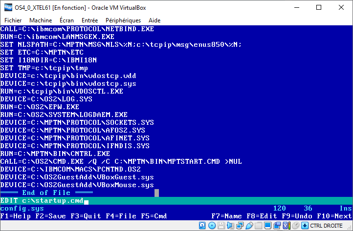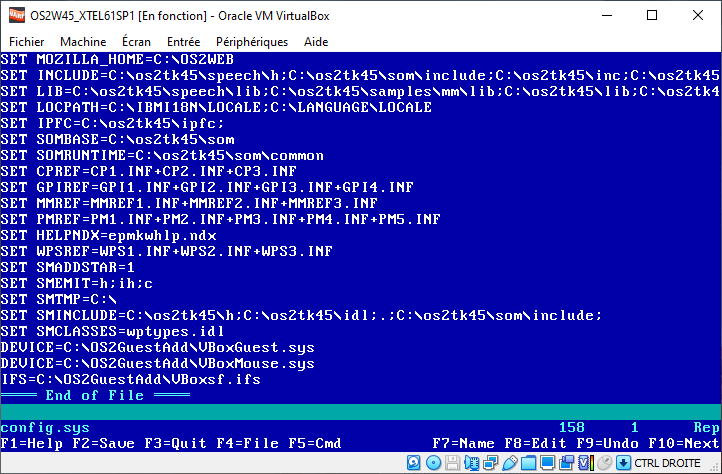 Il se trouve sous "C:\Program Files\Oracle\VirtualBox\VBoxGuestAdditions.iso" - Démarrer la machine virtuelle, dès que l'écran avec le petit carré blanc suivi de OS/2 s'affiche, appuyer sur ALT et F1.