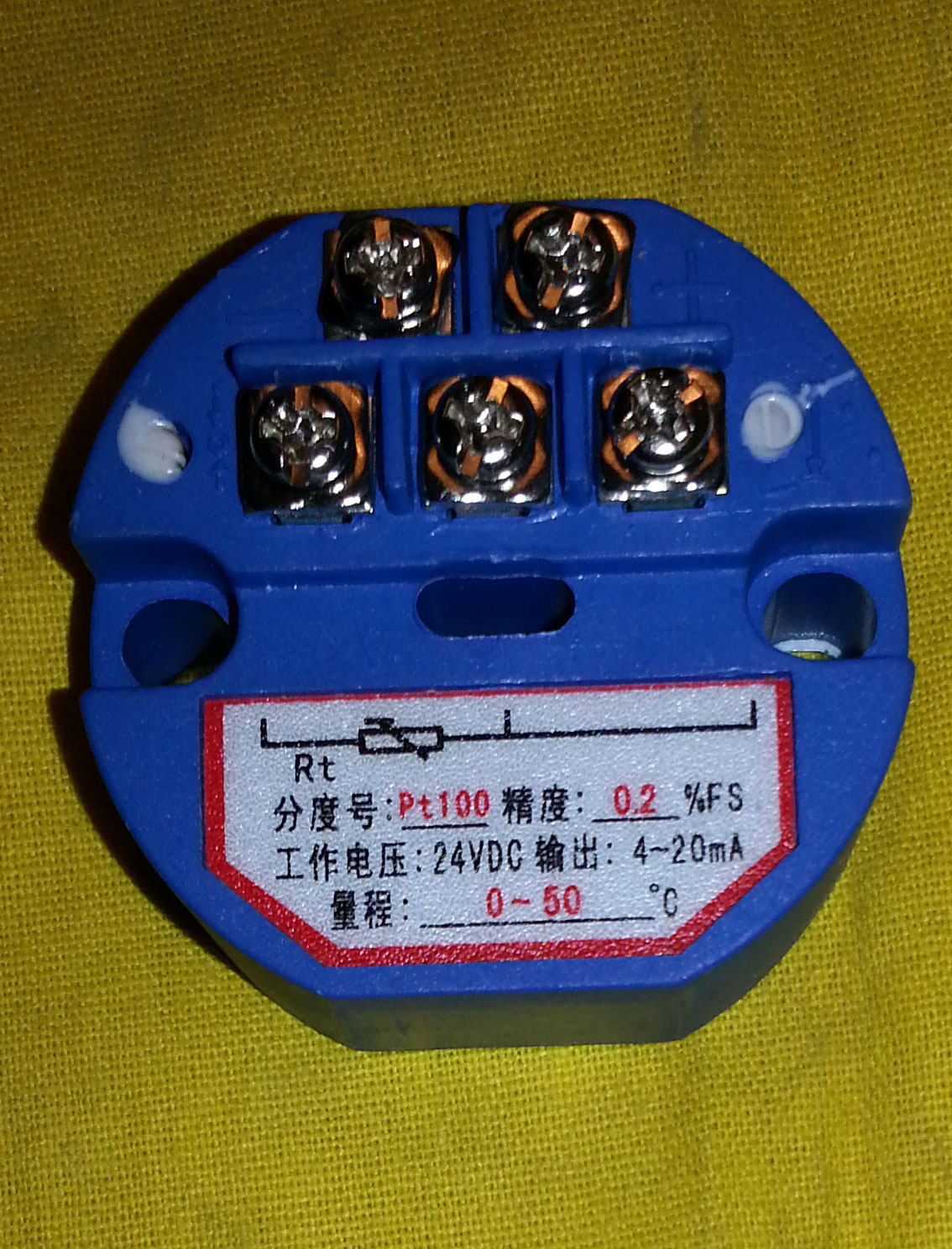 J'ai reçu ma thermistance PT100 (sans schéma comme souvent) c'est un boitier Bleu diamètre 45 m/m il sort 0 a 20ma de 0° a 50°