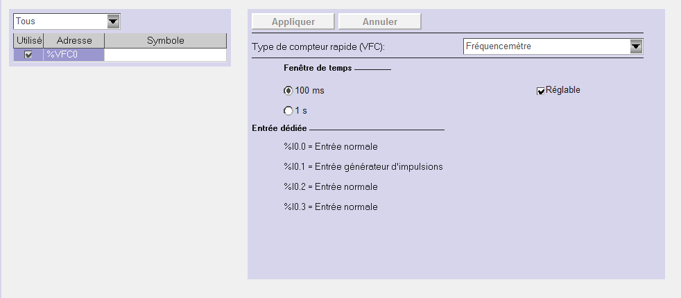 envoyer les impulsions sur l'entrée %I0.1 et lire la fréquence sur %VFC0.V