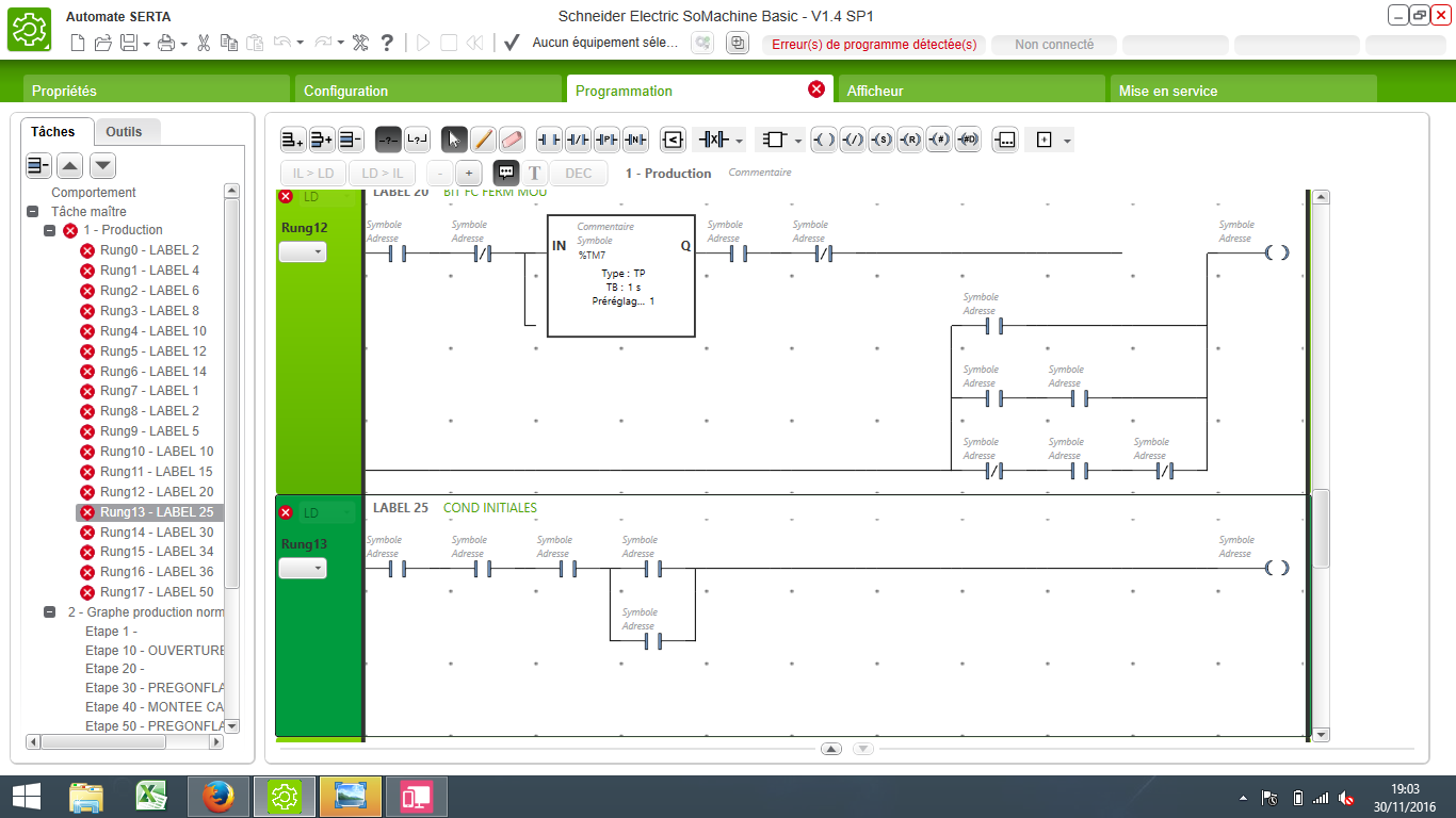Voici les deux images , c'est un Exemple , la photo est la doc que mon tuteur m'as donné de l'ancien automate , et l’impression écran est ce que j'ai essayé de retranscrire , et ce qui me fait dire que c'est faux , c'est le nombre d'erreurs que je voit affiché a l'écran , pour le moment j'ai pas mis d'adresse ni de nom d'entrée ou sortie , c'est une chose , mais je sais pas si tout ce que je fais est juste car il y as environs 40 pages de LABEL comme celle ci , donc je sais pas trop , si vous pouvez m'aider sur ce qu'il faut faire , ce qui est nécessaire avant de faire tout ça , et ce qu'il faut faire par la suite .