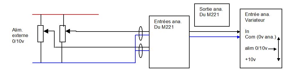 Je suis bien d’’accord, dans le doute je vais mettre un relais entre le M221 et les entrées logique comme cela j’utilise l’alim interne des variateurs et l’alim 0/10v autonome pour l’ana.