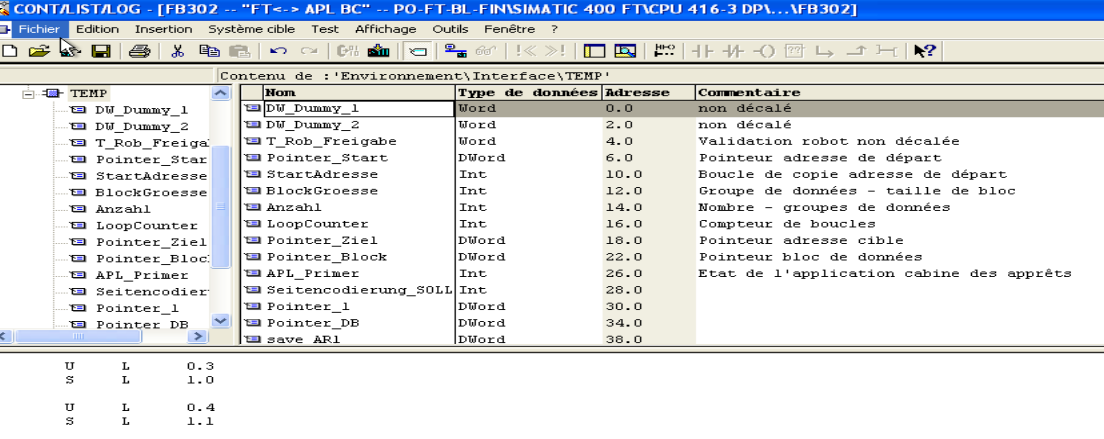 Eh oui, désolé je reviens sur les données locales, aujourd'hui ma question est la suivante: ci-dessous dans mon FB, on peut voir que ma donnée locale U L 0.3 est testée, mais dans mon bloc FB nulle part elle est écrite. Justement dans mes paramètres TEMP, est ce qu'il y aurait un lien avec L0.3.Si ce n'est pas le cas, comment pourrait-il écrire cette donnée dans mon bloc pour exploiter ensuite.