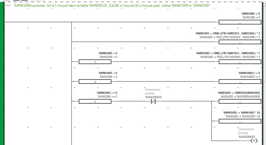 j'ai retrouvé mon exemple, je le met ci dessous à toutes fins, je l'ai adapte pour la table %MW30:10 Le n° du premier bit à 1 dans %MW1000