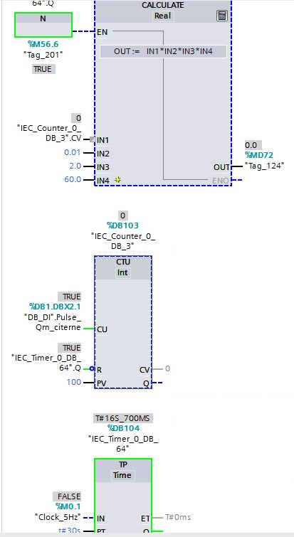 raccorde la sortie "pulse" de ton compteur a une des entrées rapides de l'automate, et utilise le "high speed counter" interne en mode fréquencemètre.