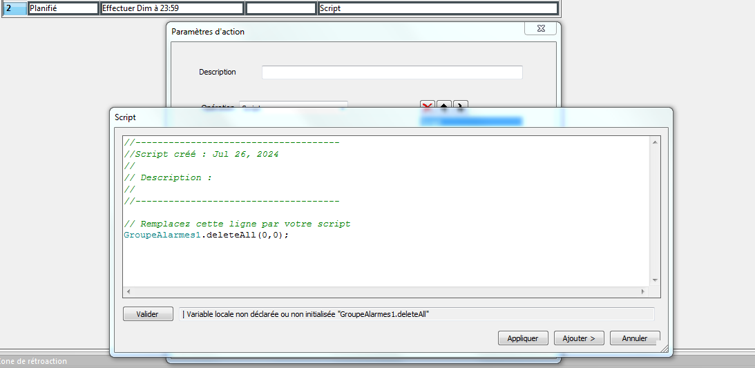 Êtes-vous sûr que le script marche ? Si vous faites "Valider" vous n'avez pas d'erreur. Car, personnellement j'ai une erreur avec le "deleteAll(0,0)" (Méthode non déclarée «deleteAll»).