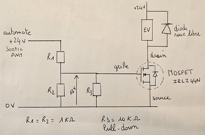 Et avec un Mosfet, comme ça j'ai 24V en permanence sur mon électrovanne et je varie l'intensité avec le PWM de l'automate.