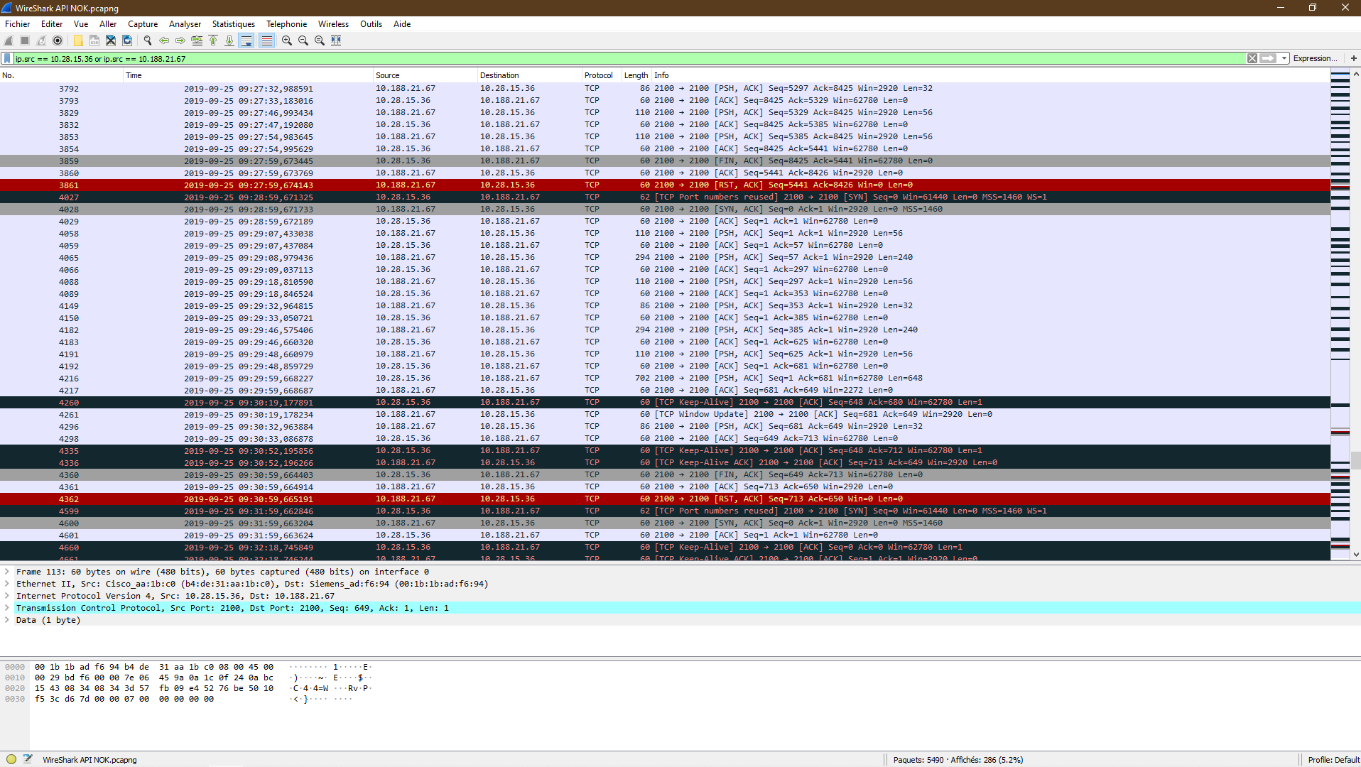 Après analyse avec Wireshark, on s’aperçoit que c'est MES qui met fin à la liaison.