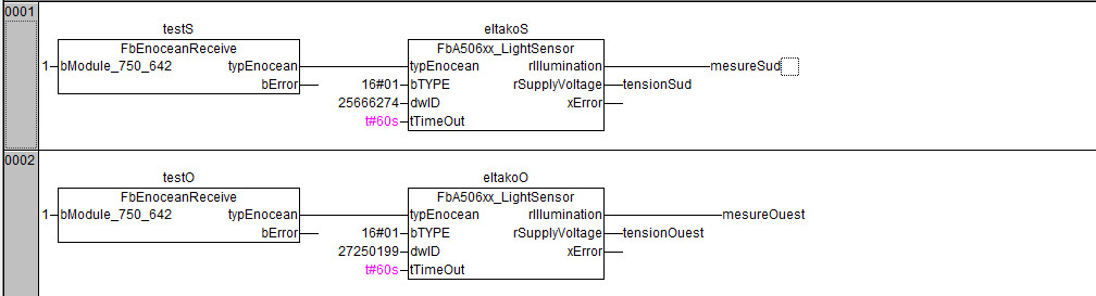 Le FB enocean receive une instance par borne 750-642, puis faire une instance du FB LightSensor pour chaque capteur de luminosité. Relier la variable typEnocean sur l'ensemble des FB