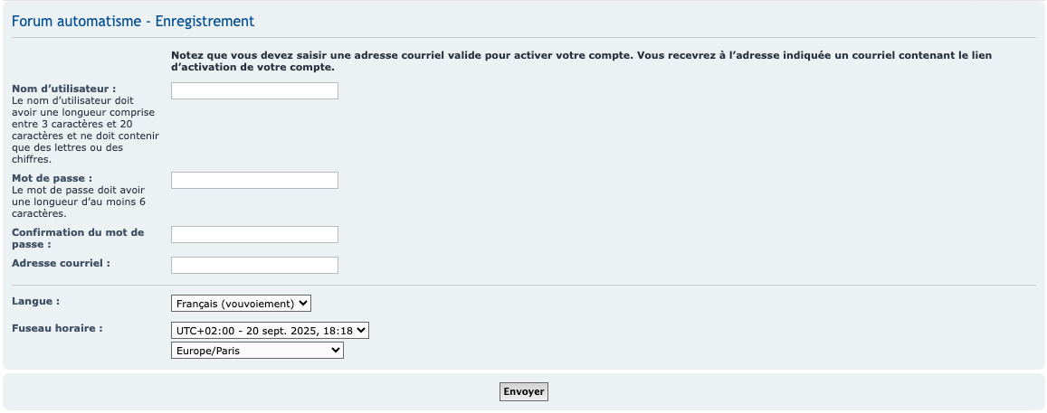 Le but est de créer un compte, puis avec ce compte créer un sujet dans la catégorie Corbeille: https://forum-automatisme.net/viewforum.php?f=58. Ainsi je constaterai que le système est fonctionnel, et je supprimerai ce compte dans la foulée.