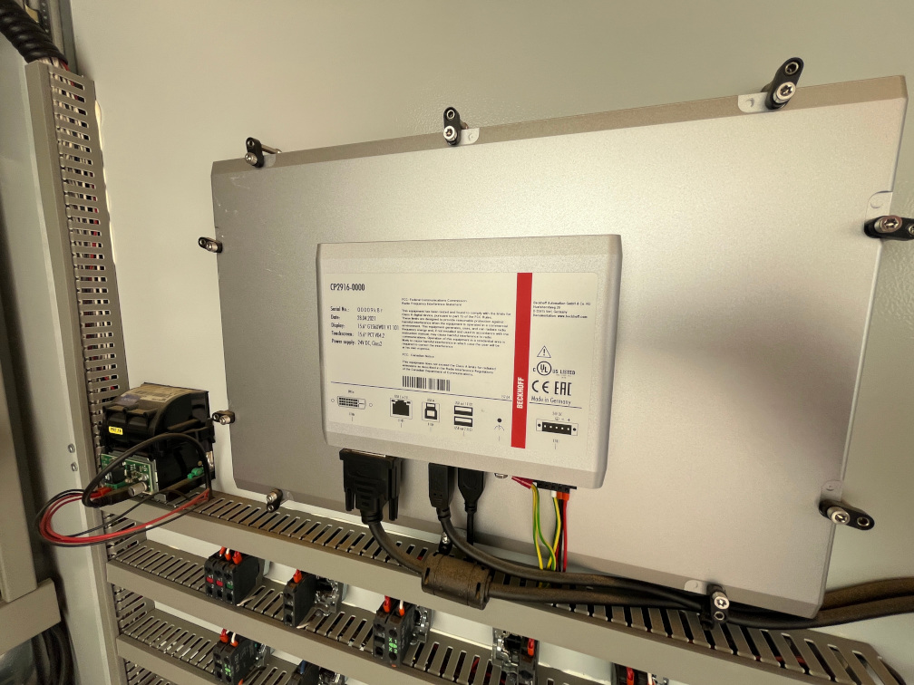 D'après les photos et une recherche sur le site Beckoff, ça ressemble fort à une configuration contrôleur CX52x0 ou proche (avec Twincat 3 embarqué), avec un écran CP29xx + interface DVI/USB qui est uniquement pour l'affichage et la fonction tactile (d'après les ports USB et DVI qui sont connectés et qu'on devine raccordés aussi sur le contrôleur). Il y a aussi un port RJ45 mais pour faire de l'USB "étendu", c'est joli comme tout.