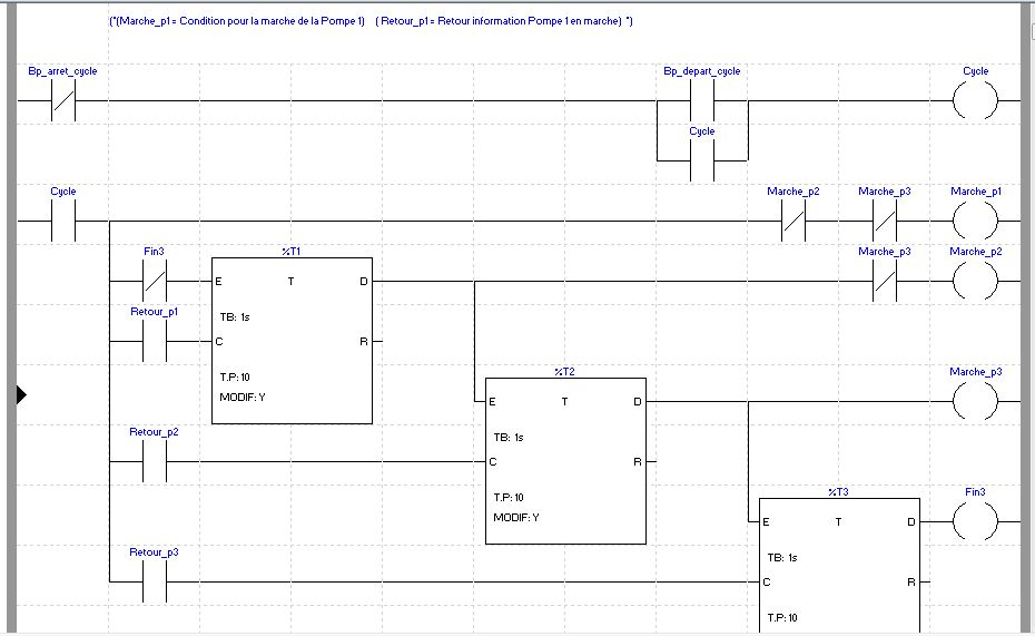 Pour les variables, AUTO_Px pour les commutateurs AUTO des pompes (X =1, 2 ou 3) je suppose que 1 c'est quand le commutateur est en AUTO, Defaut_Px pour les défauts, je suppose que le contact Défaut est à zéro en cas de défaut, ETATMARCHEPx c'est le retour d'état du contacteur (dans ns le programme ci-dessous pour des besoins de simulation j'ai utilisé les sorties de commande des pompes pour les timers mais en lieu et place il faut les remplacer par les retours d'état.)